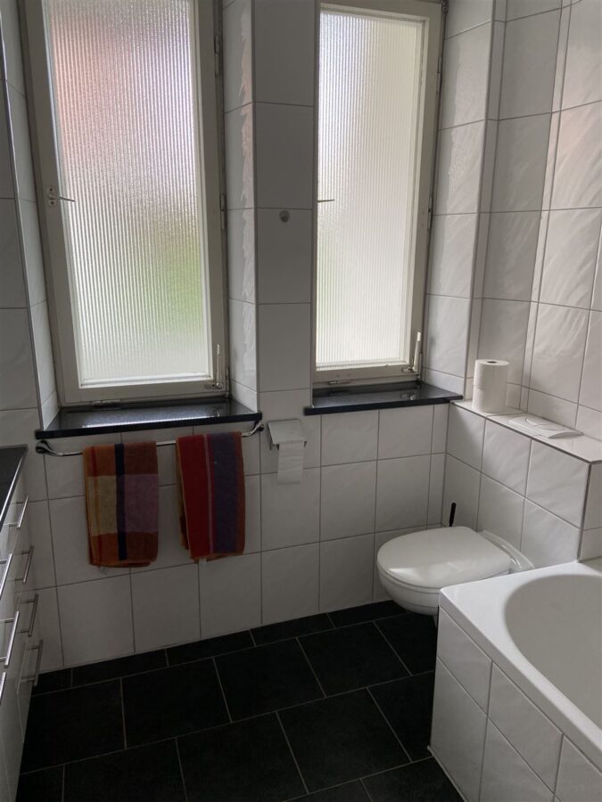 -helles Tageslichtbad mit Duschwanne, Waschbecken, WC und Einbauschrank